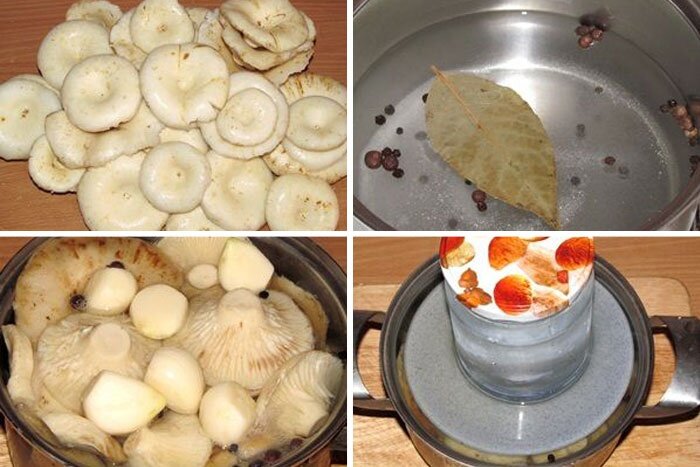 - Когда вода станет прозрачной, добавить в нее лимонной кислоты, специи, уксуса. Далее варить необходимо до того момента, пока грибы не начнут опускаться на дно. После этого их достают шумовкой, укладывают по заранее простерилизованным банкам, заливают оставшимся маринадом, закатывают крышками.
