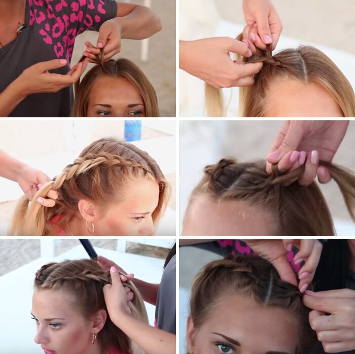 - Продолжаем поочередно вплетать прядки в прическу с обеих сторон головы, и чтоб получилось красиво, каждый раз подтягиваем волосы потуже.
