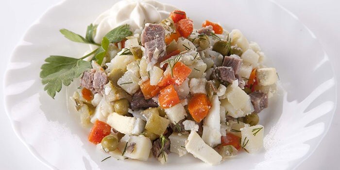 Классический салат «Оливье» с говядиной и свежими огурцами