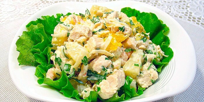 Куриный салат с консервированными ананасами