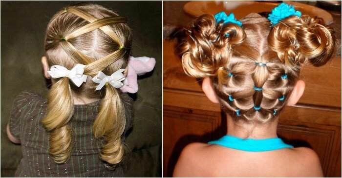 Маленькие хвостики будут прекрасно смотреться на короткой стрижке с челкой. Чтобы их сделать, мама может использовать две резинки (для простых хвостов) или четыре (так получится присобрать волосы у лобной зоны). А чтобы прическа смотрелась празднично, кончики хвостов стоит подкрутить с помощью электрощипцов или горячих бигуди. Более мелкие локоны можете создать с помощью шпилек, на которые перед сном накручиваются пряди. Готовые хвостики украсьте крупными бантами, искусственными цветами, маленькими бантиками из атласных лент.