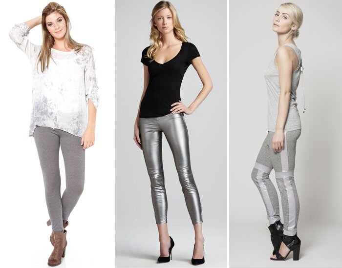 Модные лосины серого цвета могут быть темных и светлых оттенков. Они выгодно подчеркнут стройность ног. Девушкам с идеальной фигурой подойдут светло-серые леггинсы, а темные варианты обтягивающих брюк помогут скрыть недостатки телосложения. Асфальтного оттенка лосины хорошо сочетаются с длинными туниками и свитерами. Со стальным цветом обтягивающих брюк прекрасно будет гармонировать верх в пастельных, темных или светлых тонах.