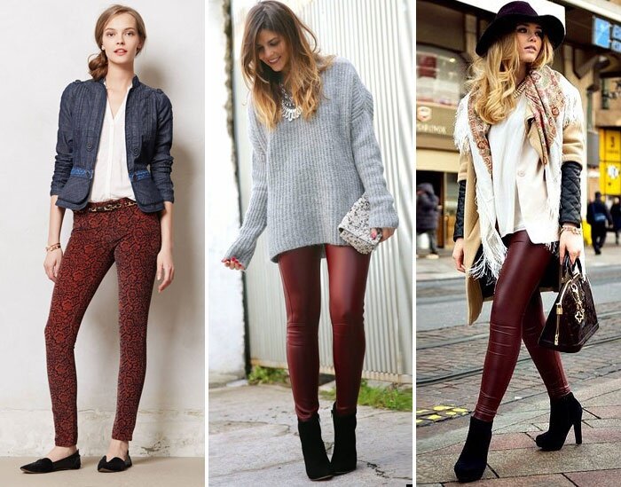 Эффектно будут смотреться модные бордовые леггинсы. Какая одежда к ним подойдет? Бордовые лосины – это яркий акцент, их необходимо комбинировать с нейтральным верхом. Но вместо черного оттенка лучше использовать темно-синий, бордовый, коричневый. Интересным вариантом гармоничного образа является сочетание ярких лосин с одеждой контрастных цветов. Бордовые кожаные лосины прекрасно сочетаются с мятным кардиганом, а аксессуары для создания образа в этом случае лучше подбирать спокойных тонов.