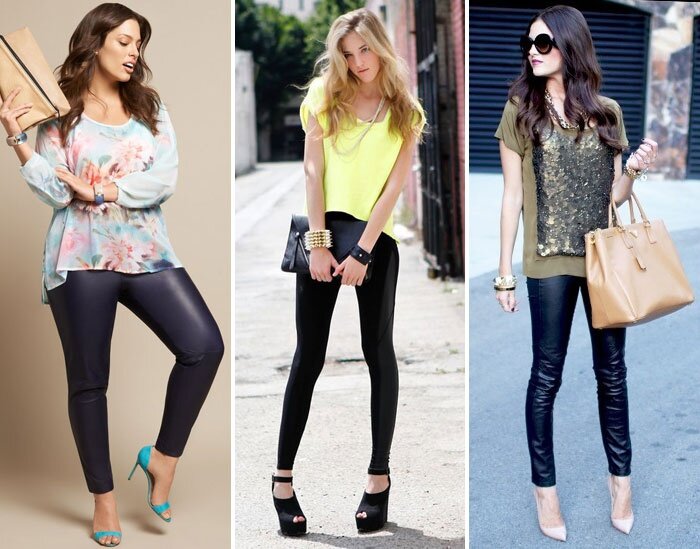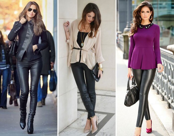 Одежда из кожи присутствует в модных коллекциях известных брендов. Множество девушек любят носить такие вещи, потому что они универсальны. Особую популярность среди молодежи завоевали кожаные лосины. Они удачно подчеркивают стройность ног и красивое телосложение. Кожаные леггинсы выглядят стильно, модно. Обтягивающие штаны из грубого натурального материала отлично сочетаются с мягкой, уютной одеждой. На выход к черным кожаным лосинам прекрасно подойдет модный короткий топ и яркий желтый пиджак, а под красные леггинсы можете надеть белый топ и пиджак.