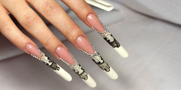 На ногтях пайп выигрышно смотрятся разнообразные варианты дизайна. Самый удачный – это цветной или белый френч, который способен подчеркнуть необычную форму. Прекрасным вариантом считается рисунок китайской росписи, который подходит для весенне-летнего сезона. Чтобы сделать ногти не такими заметными, используется покрытие однотонным нюдовым лаком. Это отличное решение для офиса. Для дизайна ногтевой пластины пайп может применяться кружево, необычные узоры и орнаменты, камни и другие материалы декора.