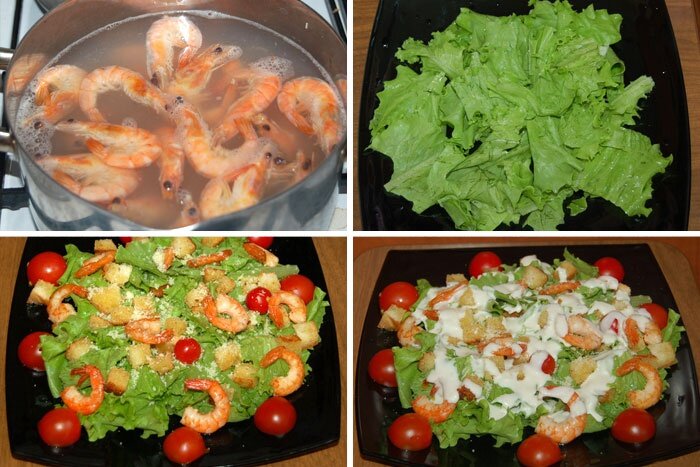 Базовые продукты для приготовления салата Цезарь с тигровыми или обыкновенными креветками: