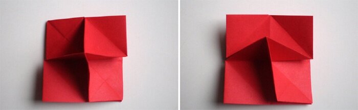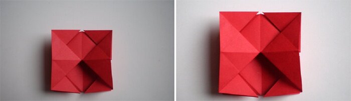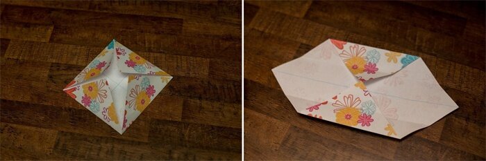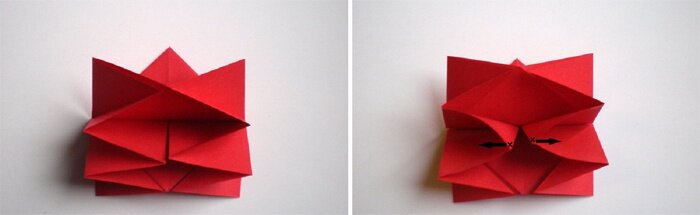 - Раскрываем, расплющиваем треугольники, потянув вниз за уголки.