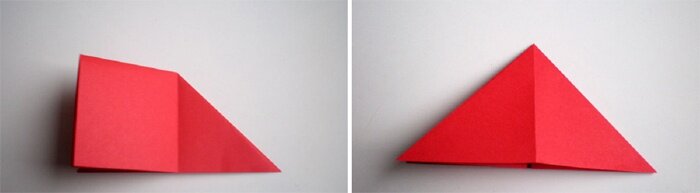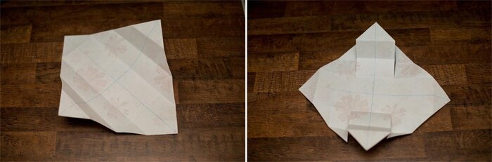 - Отгибаем назад два угла, оставшиеся складываем вровень с центральной линией пополам, как на фото.