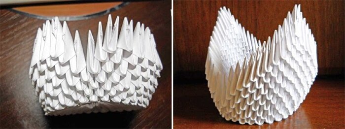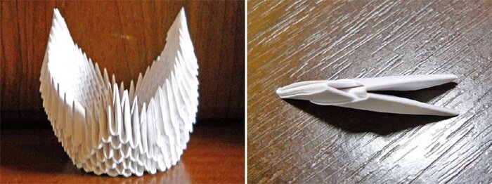 - Модульное оригами – изделие выполняется из нескольких одинаковых частей, именуемых модулями, каждый из которых складывается согласно правилам классического оригами из одного листа. Элементы между собой соединяются складыванием друг в друга, а возникающая сила трения не дает распасться конструкции.