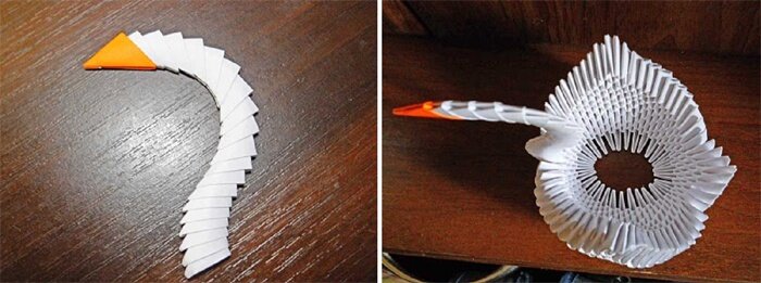 - Делаем шею и голову 10 белыми и 1 красным модулем, на котором нужно склеить уголки, чтобы клюв не был раздвоенным. Шея собирается так: уголки одного вставляем в кармашки другого модуля.