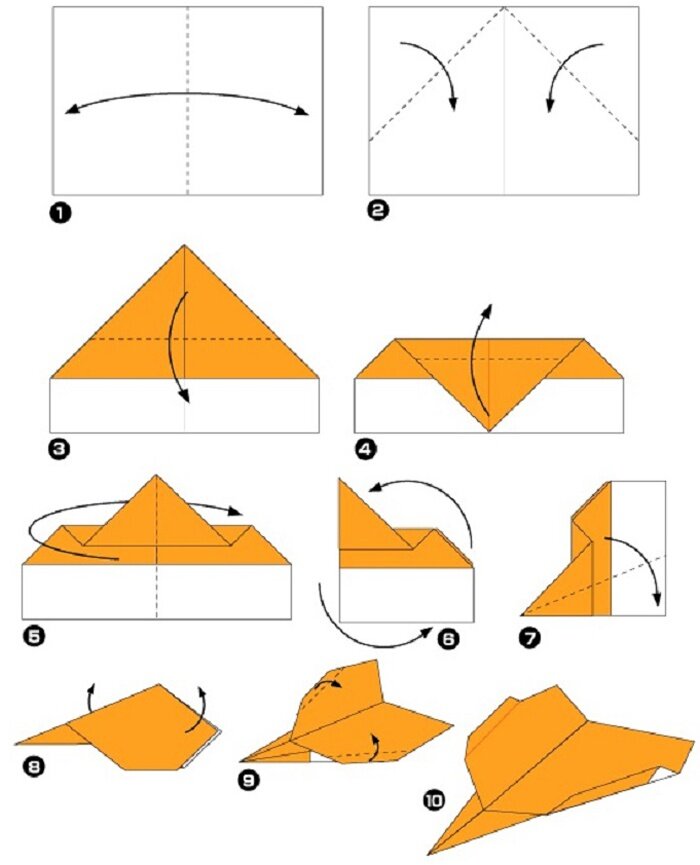 Многие в детстве складывали самолетики из вырванных из школьной тетради листочков и запускали их на переменке, наблюдая за полетом. В технике оригами очень много вариантов и форм этой поделки, начиная самыми простыми и заканчивая сложными моделями. Представленные ниже схемы наглядно демонстрируют сборку истребителей, для которых потребуется немного терпения и бумага.