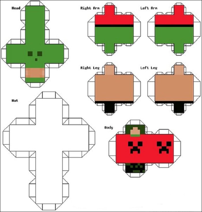Minecraft – строительная компьютерная игра жанра «песочница». Она дает игрокам создавать, разрушать различные блоки, использовать предметы в окружающей трехмерной среде. Если вам знакома игра Майнкрафт, вам будет интересно создать ее блоки и героев посредством приведенных ниже схем оригами. Вы можете использовать белую бумагу, нарисовав на ней необходимое изображение, либо распечатать шаблоны.