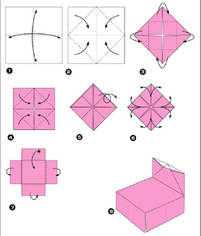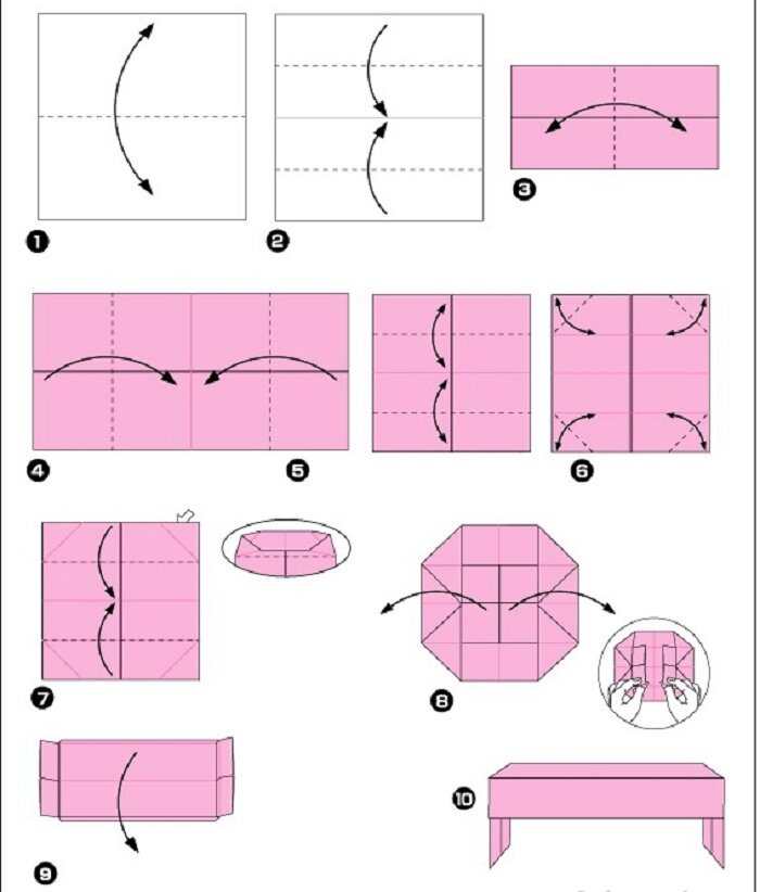 Очень увлекательно делать оригами мебель по схемам из бумаги. Вы можете создать окно, диван, стол, кровать, парту, кресло. Такие поделки подойдут для будущих игр деток, создания кукольного домика, аппликаций. Бумагу можете выбирать любую разных оттенков. Создав несколько фигурок, вы получите целый комплект миниатюрной мебели. Все схемы легкие, поэтому даже ребенок сможет заняться поделками.