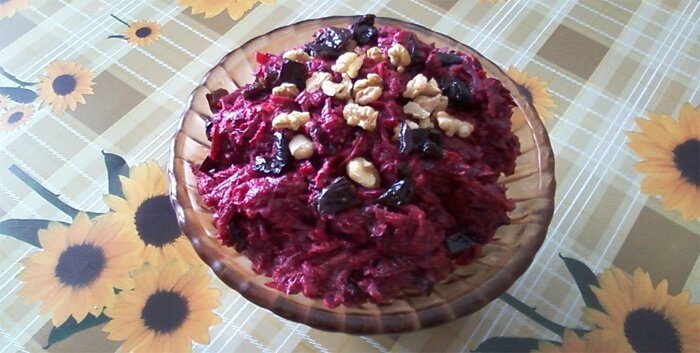 - Завершающий слой – свекла с черносливом, орехи.