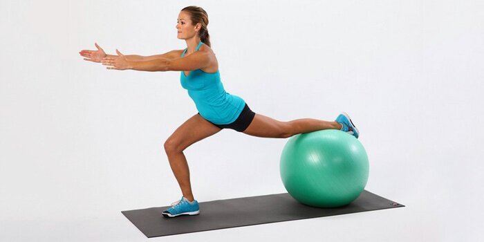 - Неглубокие приседания. Стопа одной ноги ставится на шар, а другой ногой выполняются приседания на глубину, которую позволяет растяжка. Руки при этом следует держать перед собой для сохранения равновесия. Повтор 15 раз.