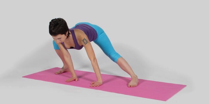 - Смените исходное положение из предыдущего упражнения, выпрямив переднюю ногу и поставив ее на пятку. Обеими руками упритесь в коврик, выполняйте наклон к правой ноге. Важно следить, чтобы ваша спина была ровной. Когда почувствуете максимальное натяжение вашего тела, задержите, считая до 30. Медленно сменяйте позу к следующему упражнению.