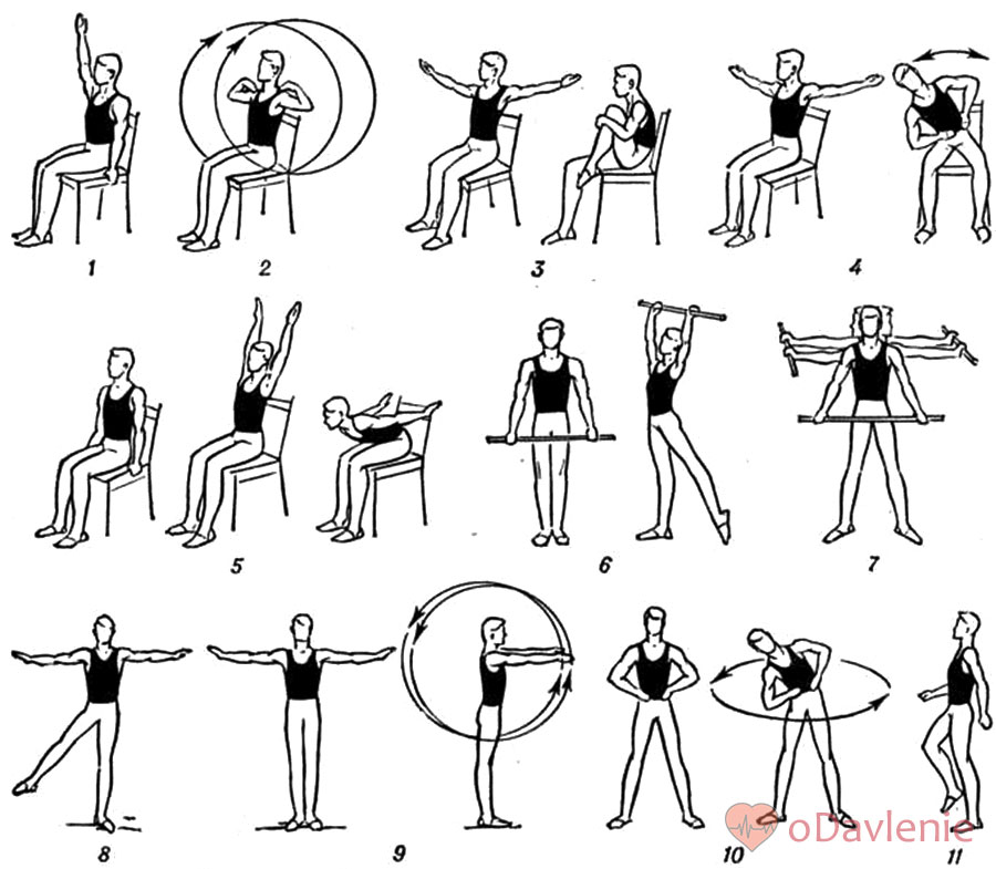 Ежедневные физические занятия при высоком АД обычно выполняются сидя или лежа. Некоторые, редкие движения выполняются стоя.