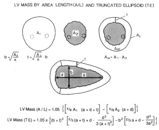 В первой формуле (ASE) в толщину левого желудочка включена толщина эндокарда, во второй сходной системе расчета (PC) ее не учитывают, поэтому используемую формулу необходимо обязательно указывать в результате исследования, так как трактовка данных может оказаться ошибочной.