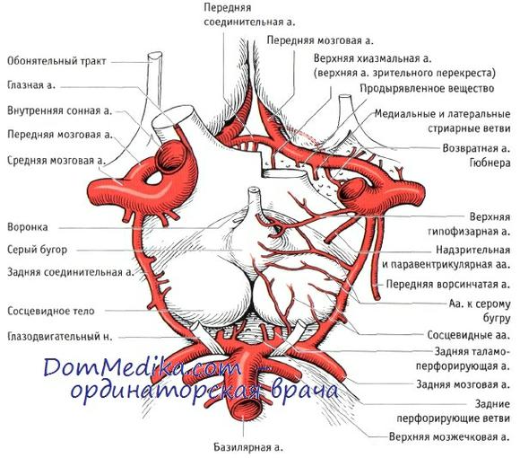 Сосуды мозга соединяются между собой (анастомозируют) на основании ГМ. Образуют бассейн виллизиева круга такие сосуды: