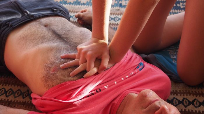 Если реаниматор один, нажатия и вдохи чередуются с частотой 15 к 2. Когда помощь оказывают два человека, отношение — 5 к 1. Каждые две минуты нужно проводить контроль интенсивности реанимации, проверяя пульс на сонной артерии.