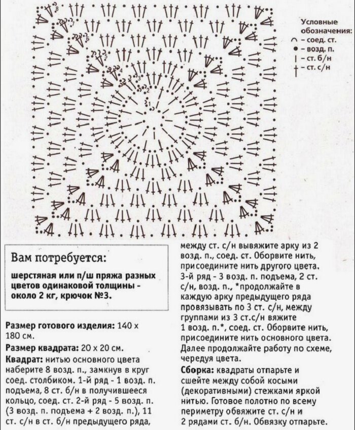 Предложенный вариант пледа состоит из квадратов со стороной 20 см. Каждый квадрат начинается с набора круга из воздушных петель. После этого создается узор петлями подъема, столбиками с накидом и без. В пряже необходимо использовать несколько гармонично сочетающихся друг с другом цветов. Готовые квадраты отпариваются, сшиваются декоративными стежками между собой. Готовый плед обвязывается столбиками с накидом и без.
