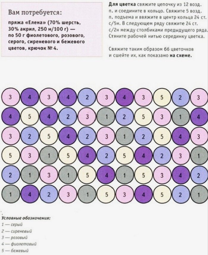 Предложенный вариант схемы коврика, включающий подробное описание для начинающих, очень простой. Он создается из отдельных элементов в виде цветочков, которые между собой после сшиваются в порядке, указанном на фотографии. Каждый цветок начинается с набора воздушных петель, которые соединяются кольцом. Далее в центр ввязываются столбики с пятью накидами в первом ряду, с двумя в следующем.