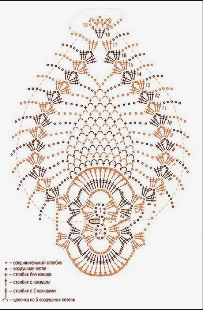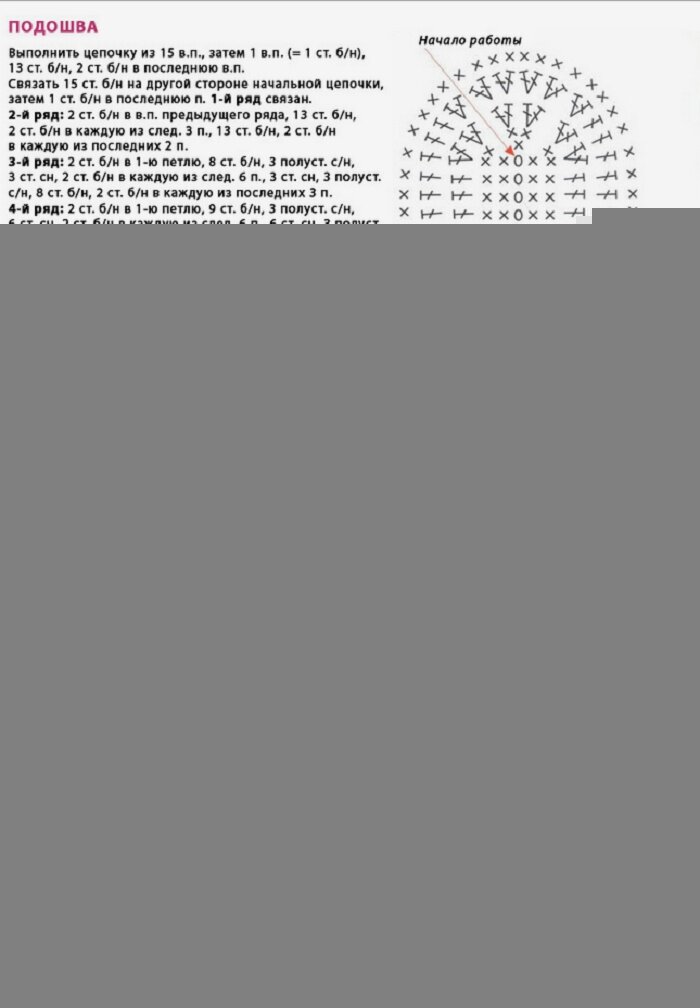 По предложенной схеме с подробным описанием для начинающих вязание пинеток крючком начинается с подошвы. Для этого необходимо набрать 15 воздушных петель, дополнительную для поднятия ряда. Длина получившейся цепочки должна соответствовать размеру стопы. Далее необходимо провязать полустолбики очень плотно. После чего переходите к столбикам с накидом. Дальше вяжите по схеме верх от основания подошвы до щиколотки: сначала идут столбики без накида, а заканчиваете, как и подошву, 60 петлями.