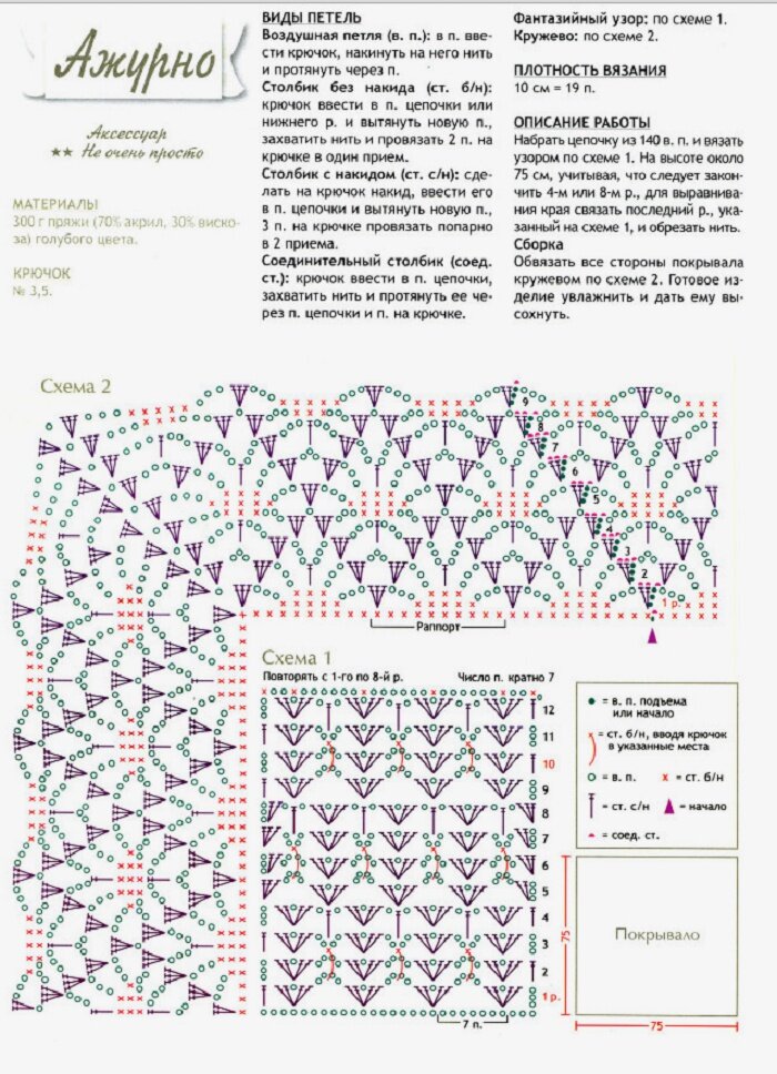 Выбирайте пряжу для вязания крючком, которая будет приятна телу малыша. Работа начинается с набора цепочки из 140 воздушных петель. После начинается первый узор, описание которого вы найдете в приложенной схеме с подробным описанием. Когда вы дойдете до нужной высоты, вязка заканчивается, а нить обрезается. Далее все стороны покрывала обвязываются кружевом по второму узору.