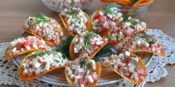 - Перемешать все эти компоненты, добавить майонез. Фаршированные салатом чипсы подавать сразу.